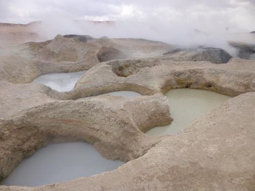 die Geysire, wo aus verschiedenen Quellen heißer, schwefeliger Dampf aufsteigt,